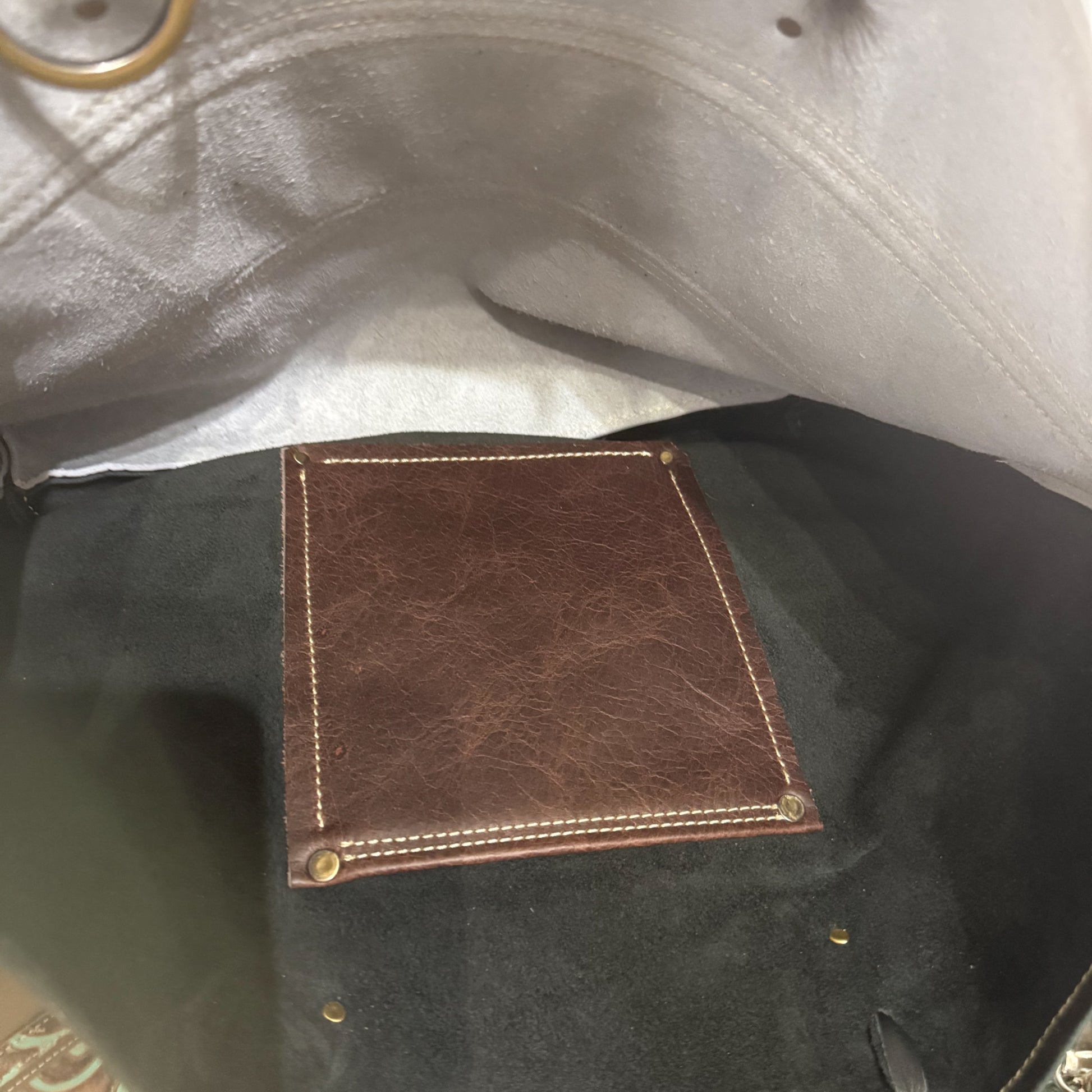 Meet Betty- she's Big Bertha's middle sister. Same soft glovey, lightweight and floppy tote as the Big Bertha but slightly smaller. Still plenty big for whatever you need to carry around. This one is a dark brindle hair on hide with Pendleton® wool in the Mesilla pattern. Lever snap key ring on front and one inside.